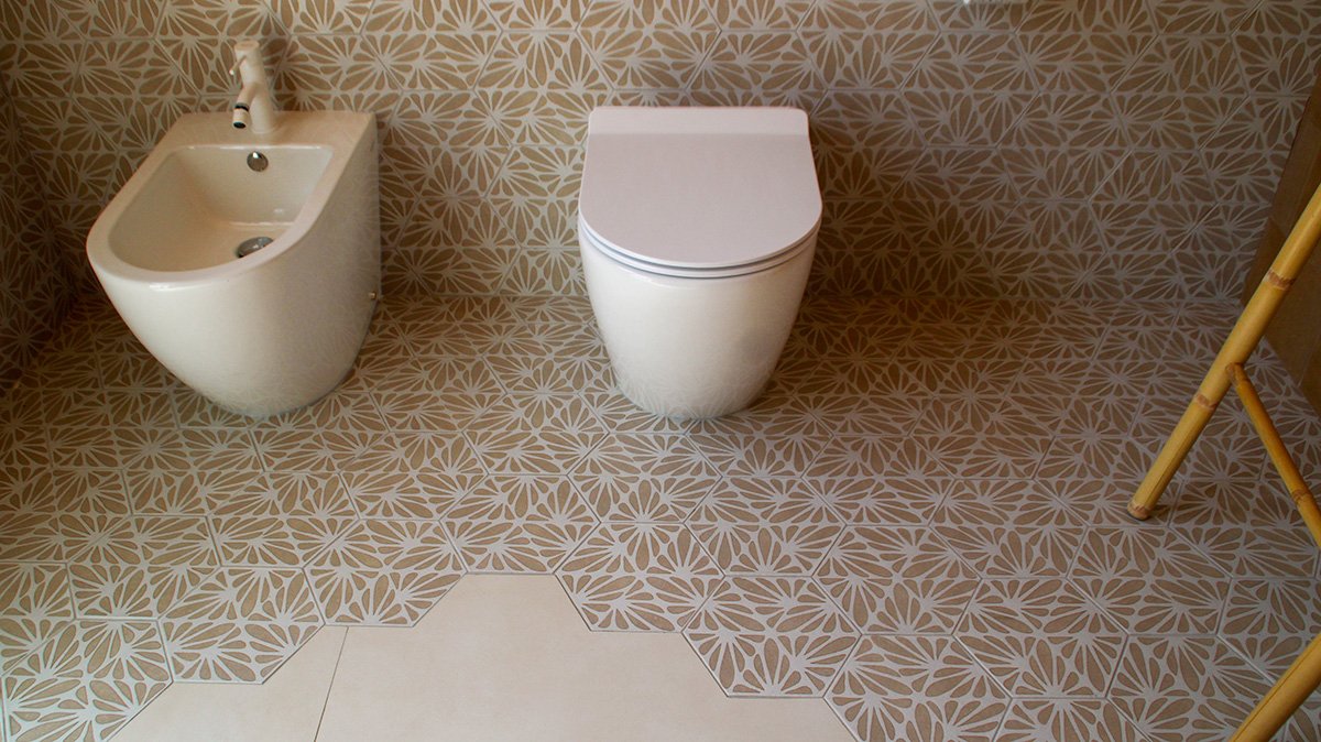- Podłoga wokół toalety – Terracreta CESELLO ARGILLA 25×21,6 cm, heksagony dekoracyjne z jasnobrązowym motywem.