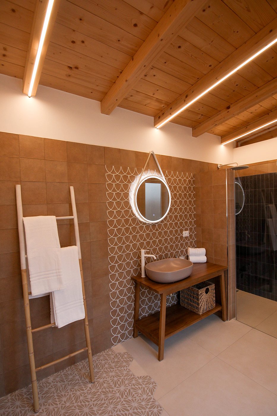Aranżacja ciepłej łazienki od Atmosfera Bubble Glamping doskonale pokazuje, jak stworzyć spójne, przytulne wnętrze z charakterem: