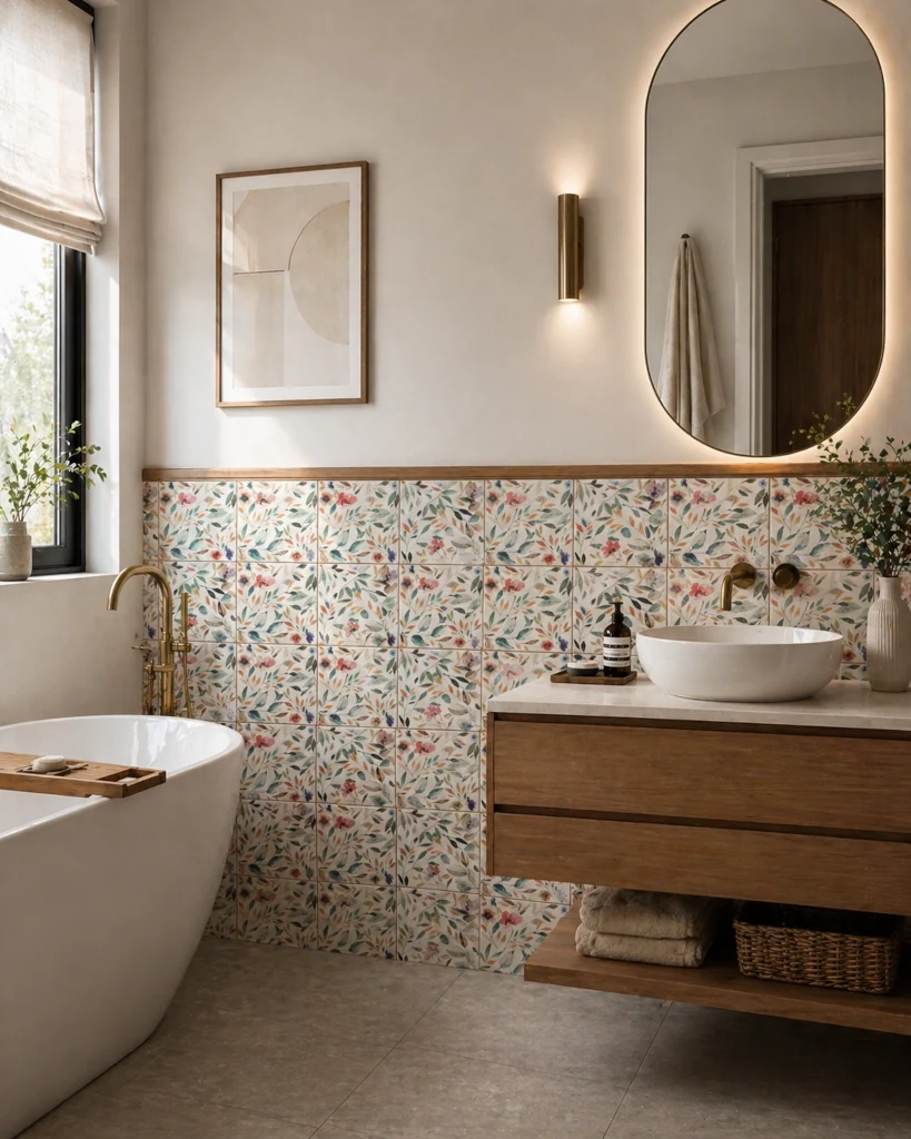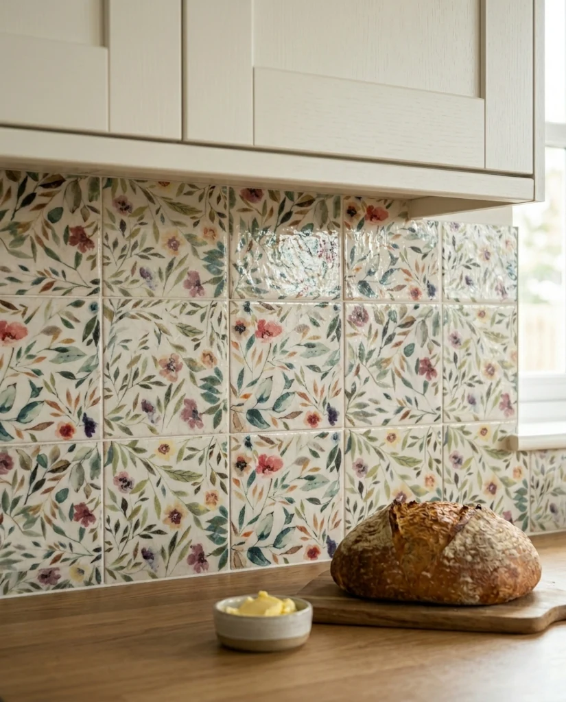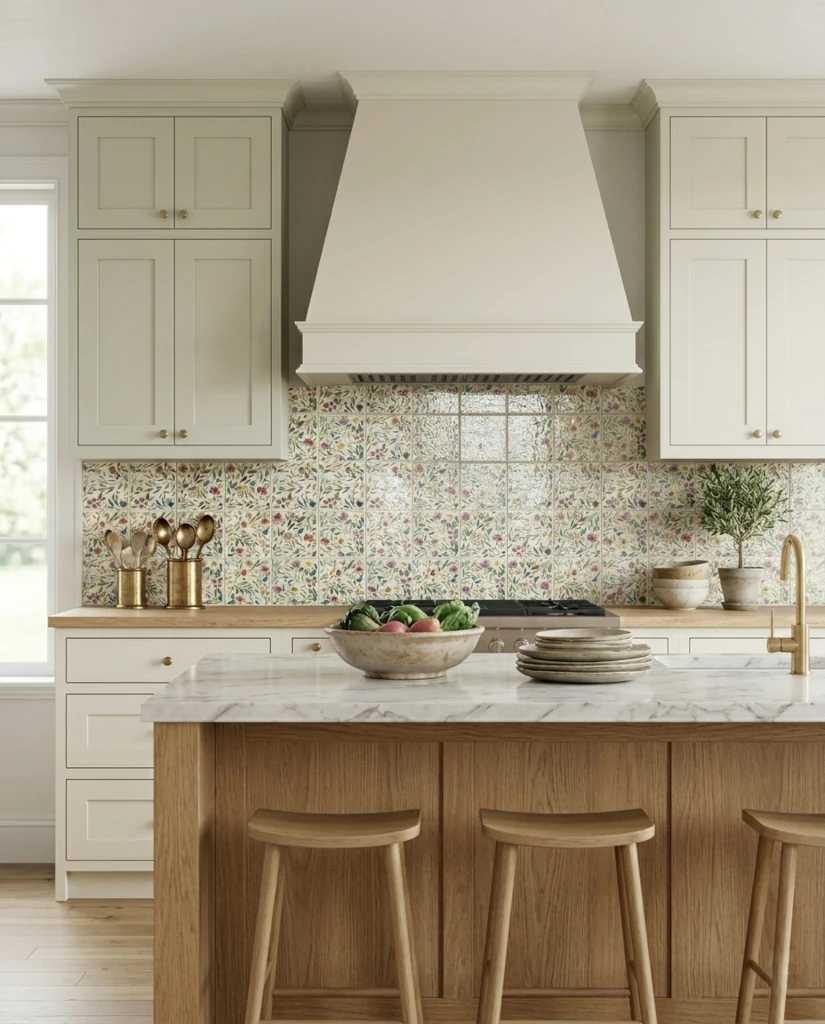 Widoczna w aranżacjach równowaga opiera się na świadomym operowaniu detalem. Kwiatowe płytki dekoracyjne Harmony Mayolica Garden 15×15 cm zdobią partie ścian lub przestrzeń nad blatem, tworząc spójną, dekoracyjną linię. Ich malarski wzór w naturalnych barwach komponuje się z drewnianymi szafkami, jasnymi frontami i klasyczną armaturą w odcieniach złota. Dzięki temu wnętrze zyskuje przytulny, dopracowany charakter, bez efektu nadmiaru.