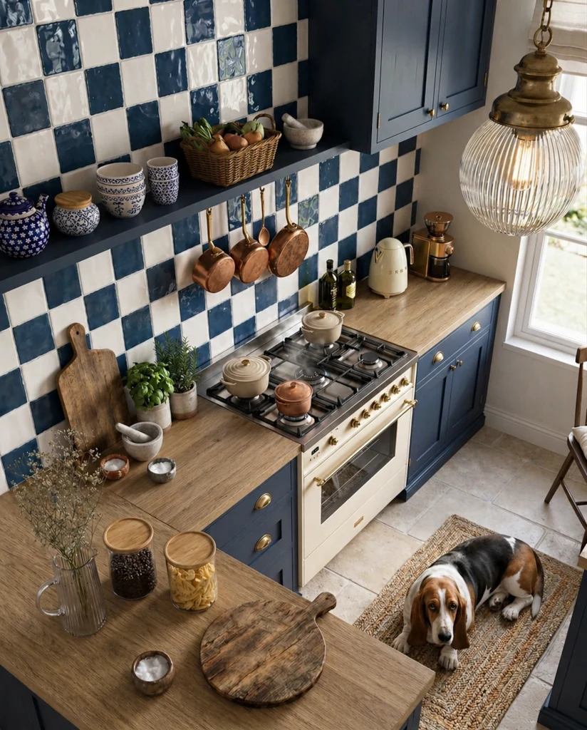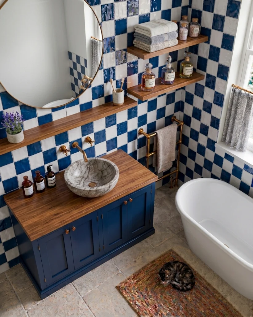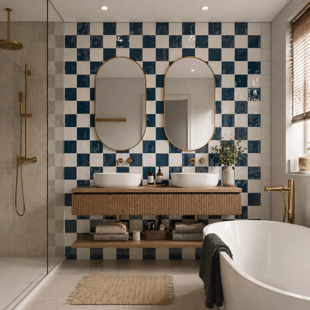 Biało-niebieska szachownica na ścianie kuchni lub łazienki to wzór, który wytrzymuje próbę czasu i kolejnych trendów. W połączeniu z drewnianym blatem, granatowymi frontami w stylu shaker i złotymi armaturami tworzy europejską, rzemieślniczą stylistykę z natychmiastowym efektem wizualnym. To inwestycja w materiał, który podnosi wartość wnętrza i buduje spójną narrację designerską.