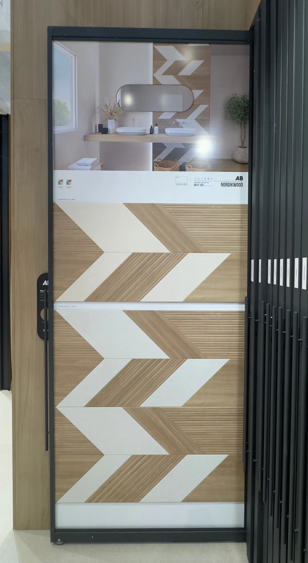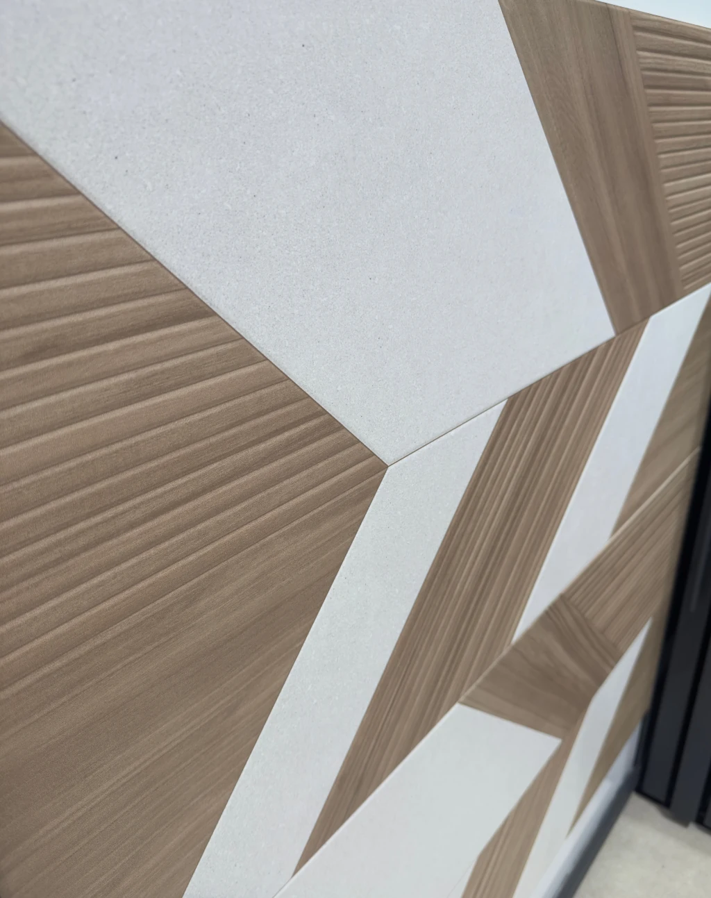 Na powierzchni płytki drewniane ryfle, dynamiczne chevrony i gładka, jasnoszara struktura betonu współgrają w spójną całość, wprowadzając rytm i głębię na ścianie. Format 60×120 cm pozwala uzyskać efekt elegancji i nowoczesności bez zbędnych podziałów, a rektyfikowane krawędzie zapewniają precyzyjny montaż i minimalistyczne spoiny. Płytka sprawdzi się idealnie na ścianach w łazience i salonie, tworząc przestrzeń, w której liczy się detal i harmonia formy.