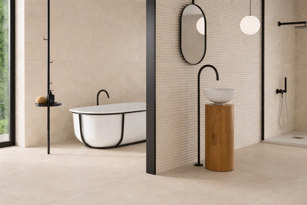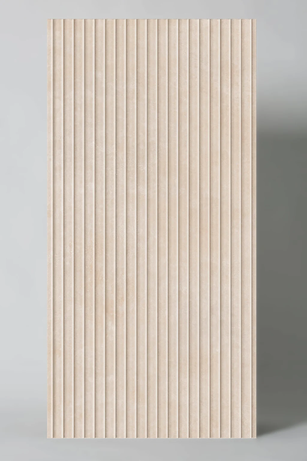 Trójwymiarowa płytka ryflowana 3D to nowoczesna interpretacja klasycznego kamienia, która nadaje wnętrzu wyjątkowej głębi. Ceramiczna powierzchnia w ciepłych odcieniach beżu łączy w sobie spokojny mat z delikatną, połyskującą strukturą, co pozwala na subtelną grę światła na ścianie. Dzięki formatowi 60×120 cm produkt pozwala na stworzenie niemal jednolitej tafli przy minimalnej ilości spoin, co idealnie wpisuje się w założenia nowoczesnej architektury wnętrz.