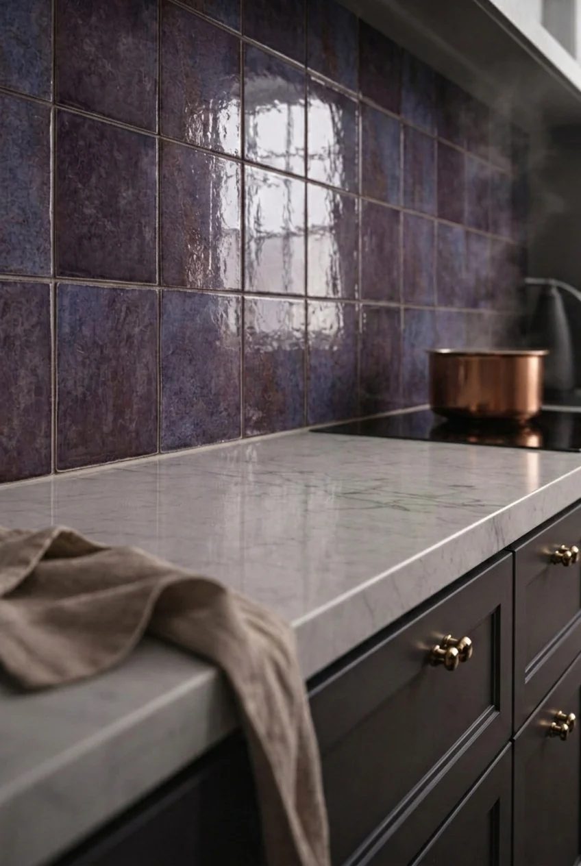 Kafelki ścienne w odcieniach fioletu w formacie 10×10 cm emanują naturalnym urokiem i subtelnym blaskiem. Ich nieregularna, błyszcząca powierzchnia z efektem ręcznego wykonania sprawia, że każda ściana nabiera życia i wyjątkowego charakteru. Inspirowane zorzą polarną, zachwycają delikatnymi przebarwieniami, które nadają wnętrzu głębię, elegancję i zmysłową harmonię.