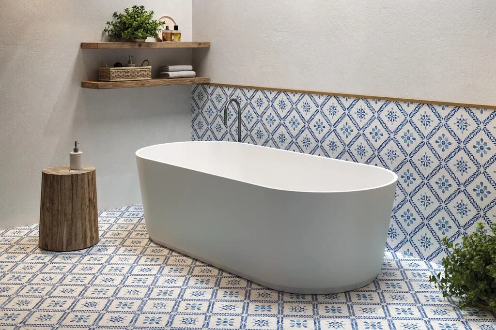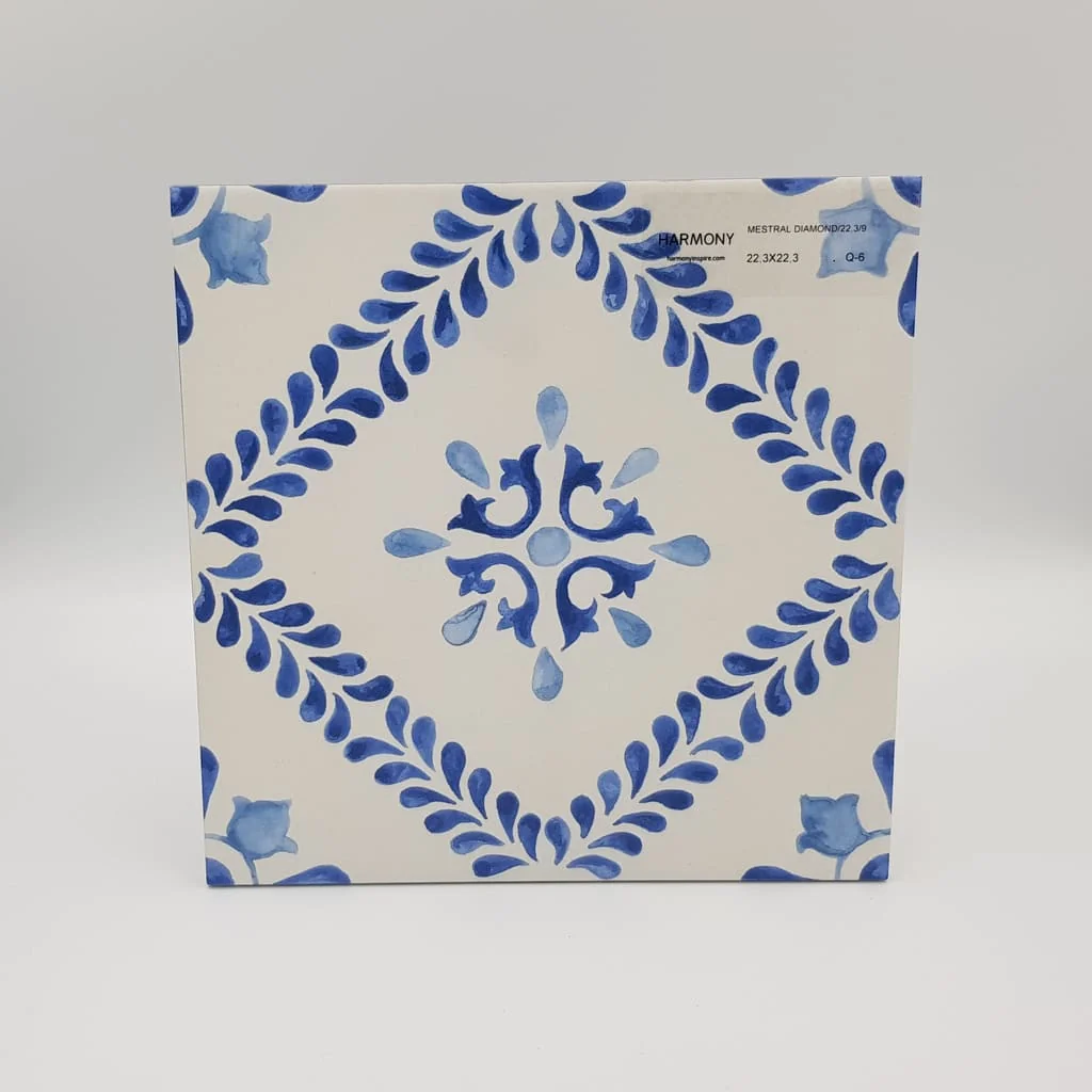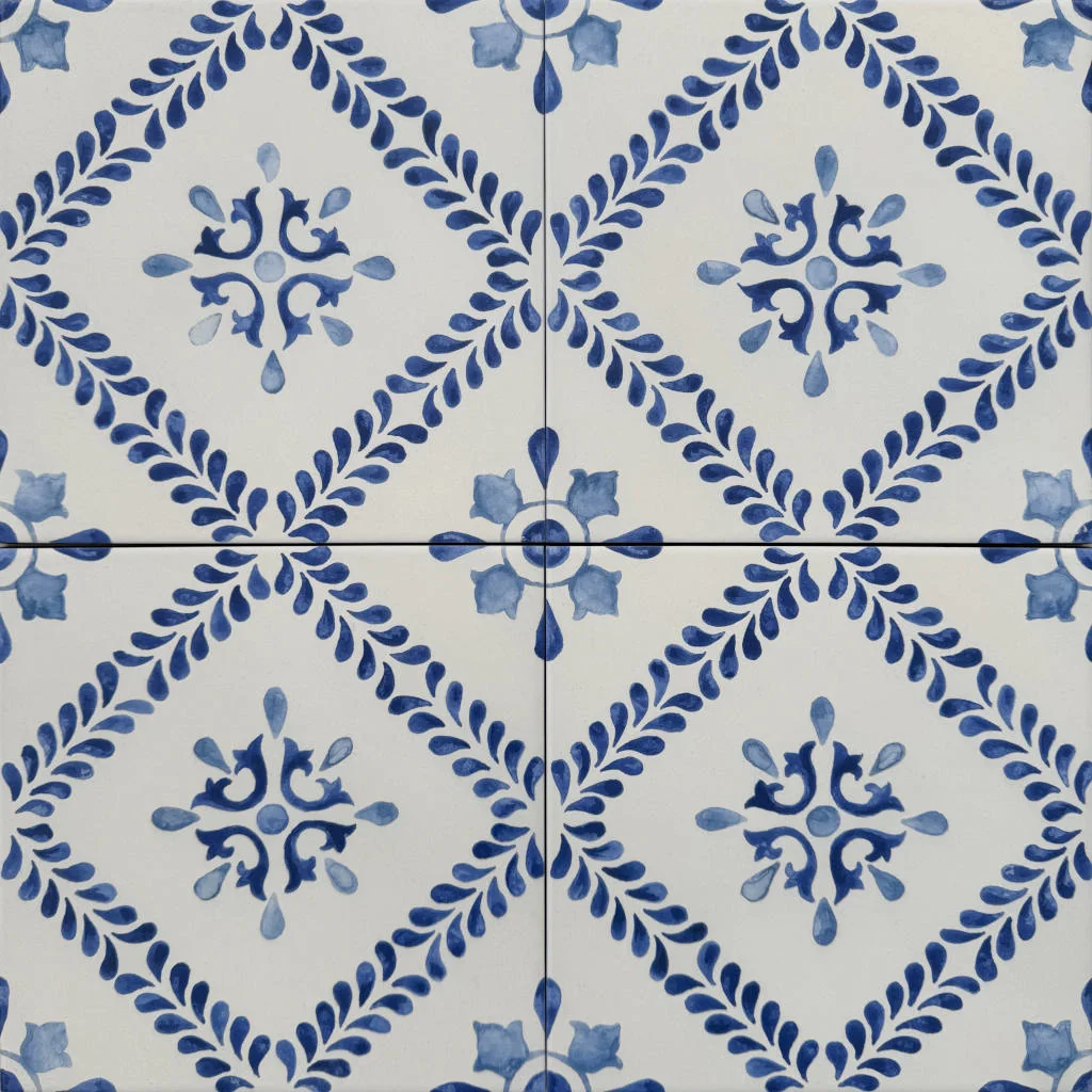 Powierzchnia utrzymana w estetyce ręcznego zdobienia tworzy efekt dekoracyjny inspirowany tradycją. Matowe wykończenie podkreśla subtelną strukturę i ogranicza refleksy światła, co wpływa na elegancki odbiór wnętrza. Niebieski wzór na jasnym tle nawiązuje do ceramiki majolikowej i wprowadza lekki, śródziemnomorski charakter. Format 22,3×22,3cm zapewnia proporcjonalny układ na ścianie i podłodze.