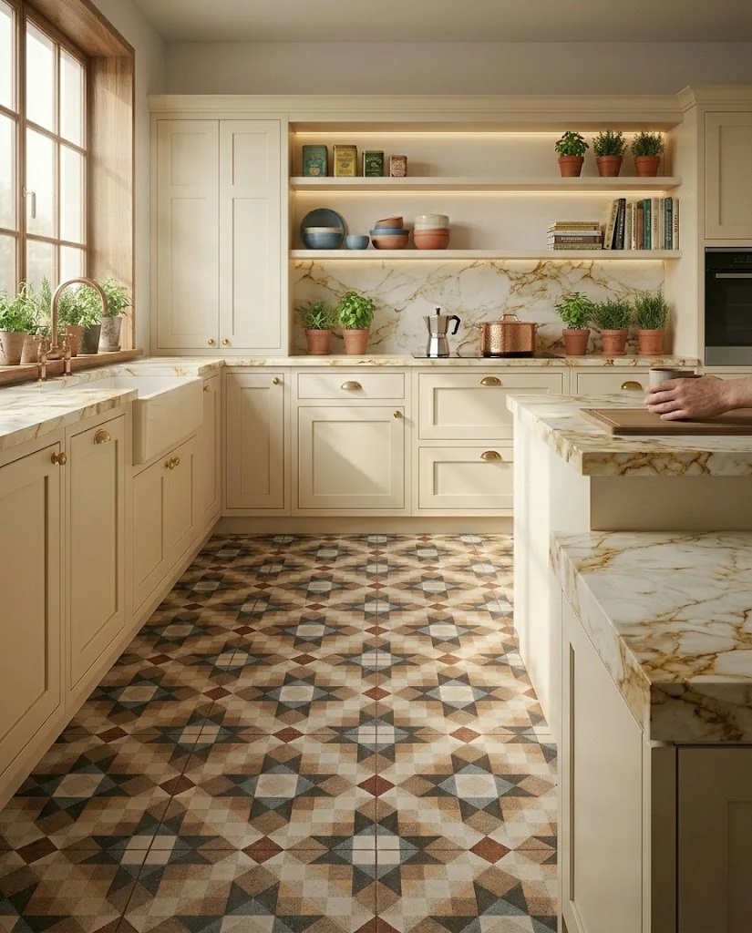 Kolorowe płytki z geometrycznym wzorem w 6 spójnych wariantach – pakowane losowo. Kafelki w formacie 45x45cm z matową powierzchnią oraz sztuczną fugą do stosowania w pomieszczeniach na podłodze.